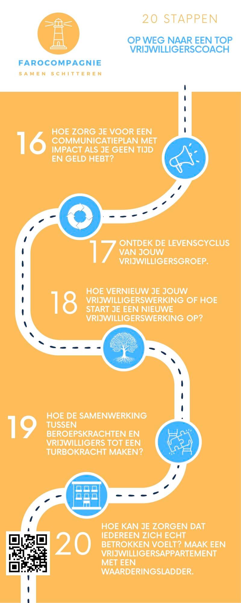 Ben je op zoek naar spitstechnologie of echt verdiepende thema's, dan kan je in stap 17 de levenscyclus ontdekken van een vrijwilligerswerking en handige tips om daar mee om te gaan. In stap 18 hebben we het over vernieuwend, pionierend vrijwilligerswerk en starten van nieuwe groepen. In stap 19 geven we tips voor een optimale samenwerking tussen vrijwilligers en beroepskrachten. En in stap 20 zoomen we in op het grote belang van connectie tussen alle vrijwilligers op een doordachte wijze en stellen we voor om een helder waarderingsbeleid uit te bouwen.